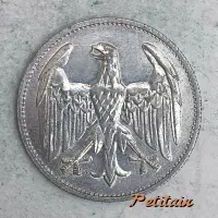 Cette pièce de 3 marks en alumium, frappée à Berlin en 1922 sous la République de Weimar, reflète la fragilité économique de l’époque. Son style sobre avec l’aigle impérial souligne la continuité symbolique malgré la crise monétaire.